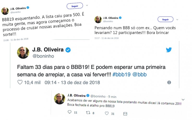 "Acabamos de ver alguns da nossa lista postando muitas dicas! Já cortamos 20!!! Boca fechada é atalho pro BBB19".