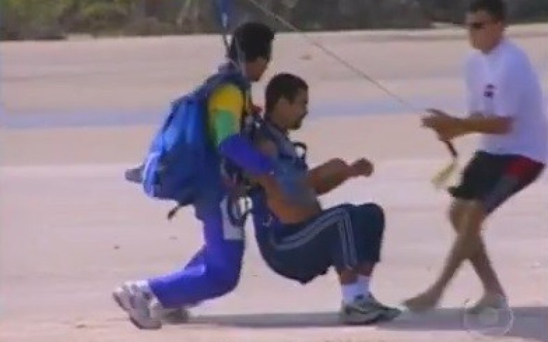 Participante chegando de paraquedas no 'No Limite - Fase Metal', em 2001