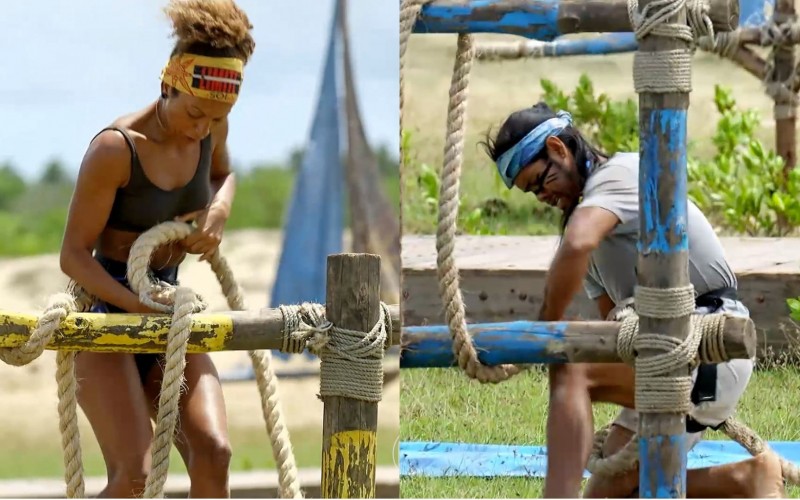 Ninha e Janaron em prova no 'No Limite' — Foto: Globo/Montagem